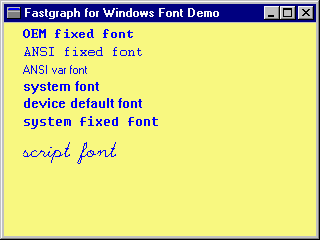 Example: Logical FontsCreating a logical font first involves defining the fields in a LOGFONT structure. In the Fontdemo example, we do this at the end of the WM_CREATE handler, filling the LOGFONT structure with values to create a 24x12 script font from one of the stock fonts. The WM_CREATE handler then passes this structure to the Windows API function CreateFontIndirect(), which returns a handle of type HFONT to the new logical font. We can then pass this font handle to fg_logfont() to activate the font for fg_print() in the WM_PAINT handler. Besides showing how to create a logical font, the Fontdemo example shows how to use stock fonts and logical fonts in Fastgraph programs. Its WM_PAINT handler successively activates each of the six stock fonts and calls fg_print() to display the font name using each font (strings are output directly to the client area). It then activates the logical font and again calls fg_print() to display the text "script font" using the logical font. The result looks like this: